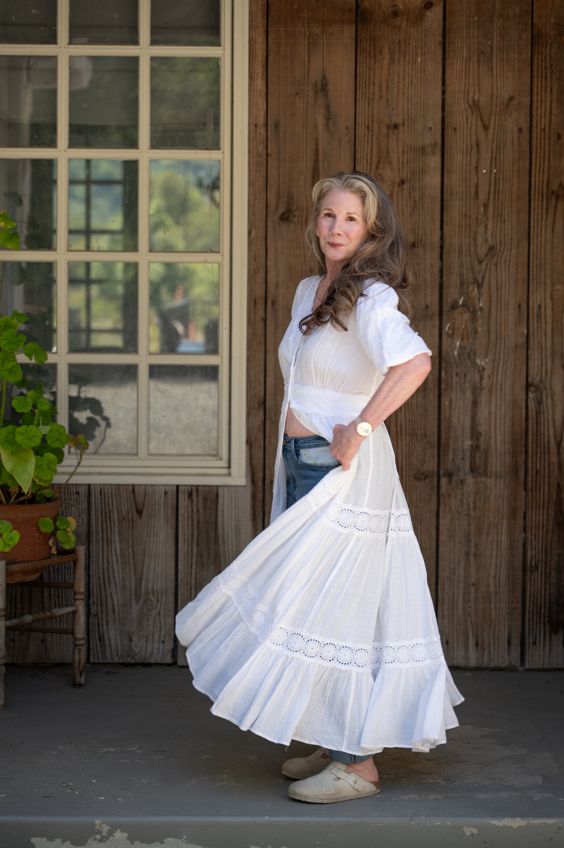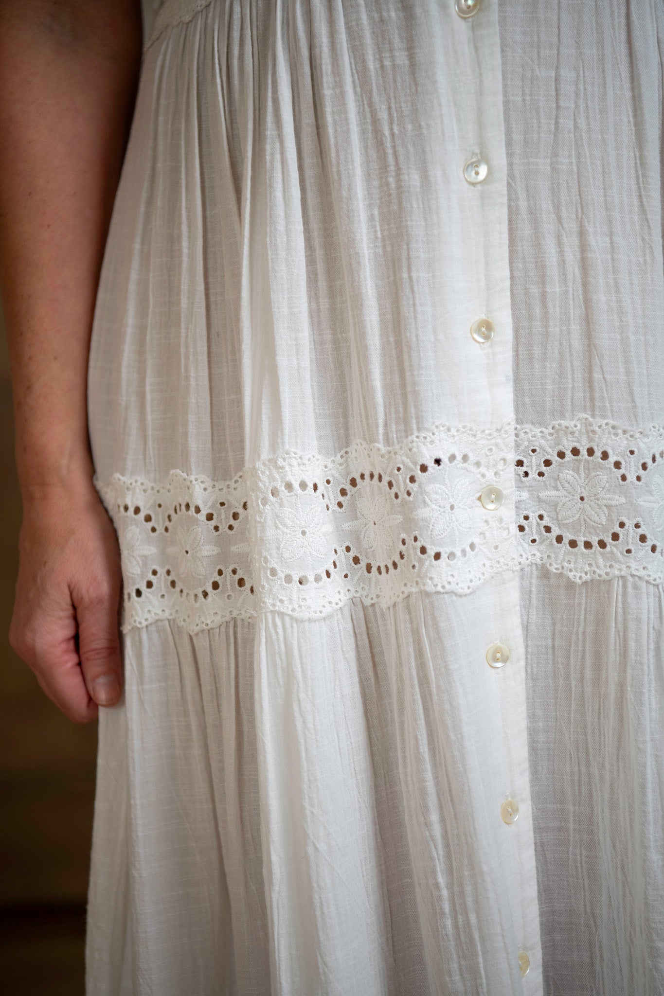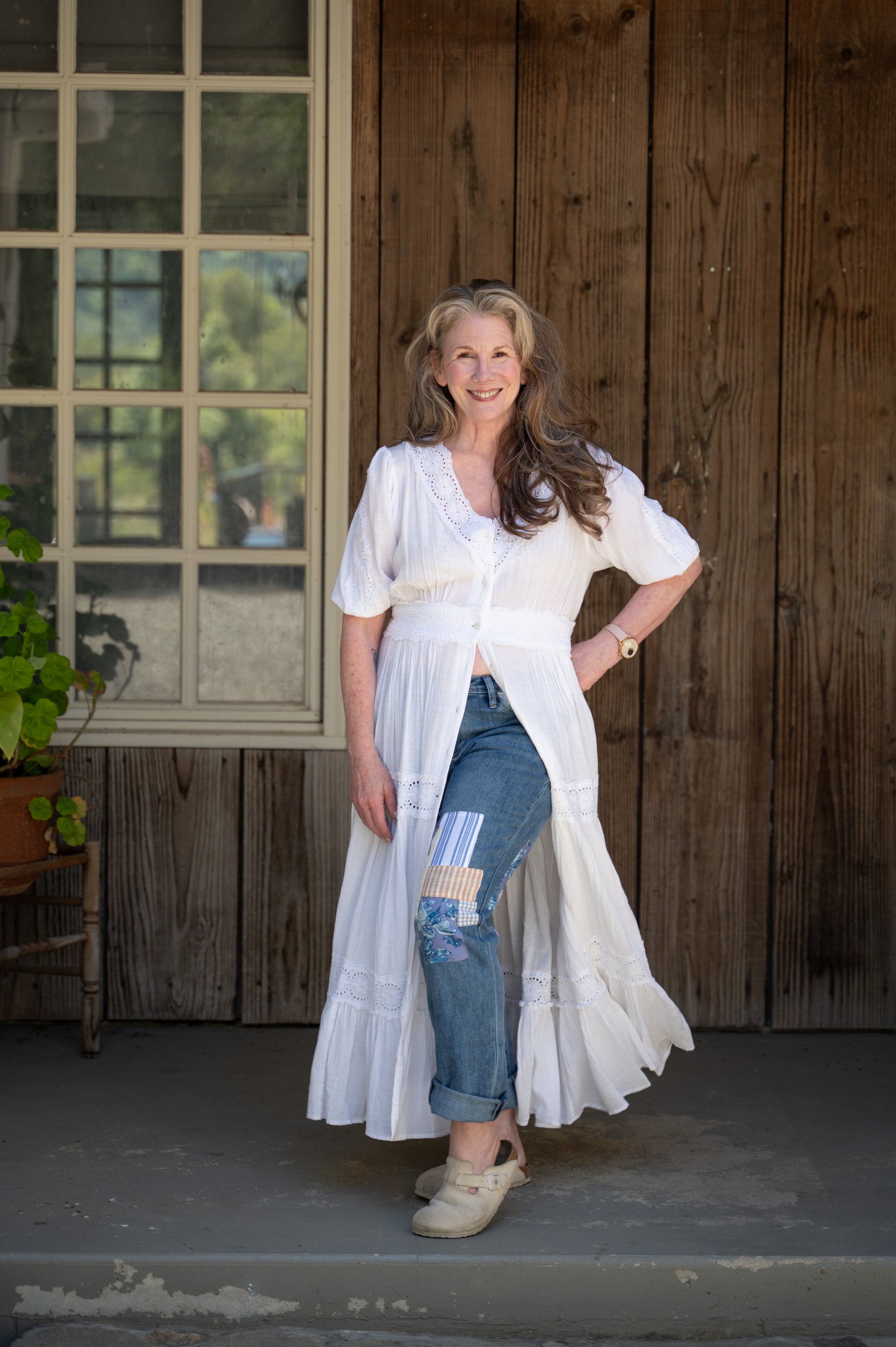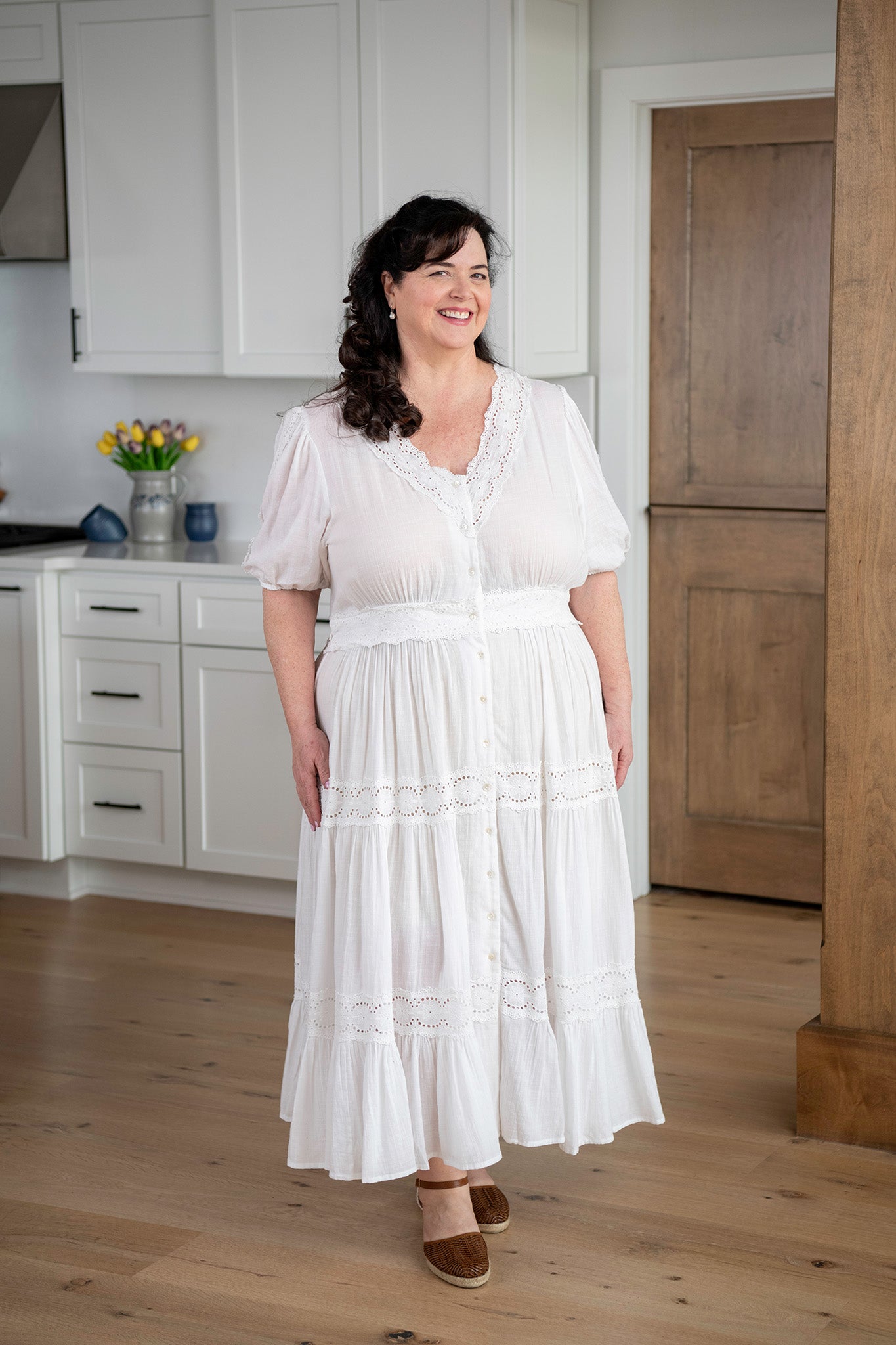 The tiered maxi skirt flows beautifully with every step, finished with eyelet lace trim for a romantic, heirloom-inspired touch. Wear it buttoned up as a dress or styled open as a breezy duster over jeans and a tee. Available in a full range of sizes, the Melissa Dress is as versatile as it is stunning—once it’s in your wardrobe, you’ll reach for it again and again.