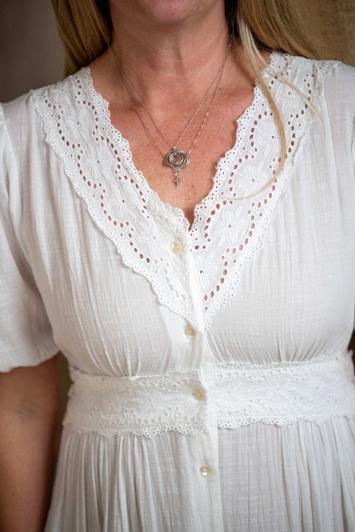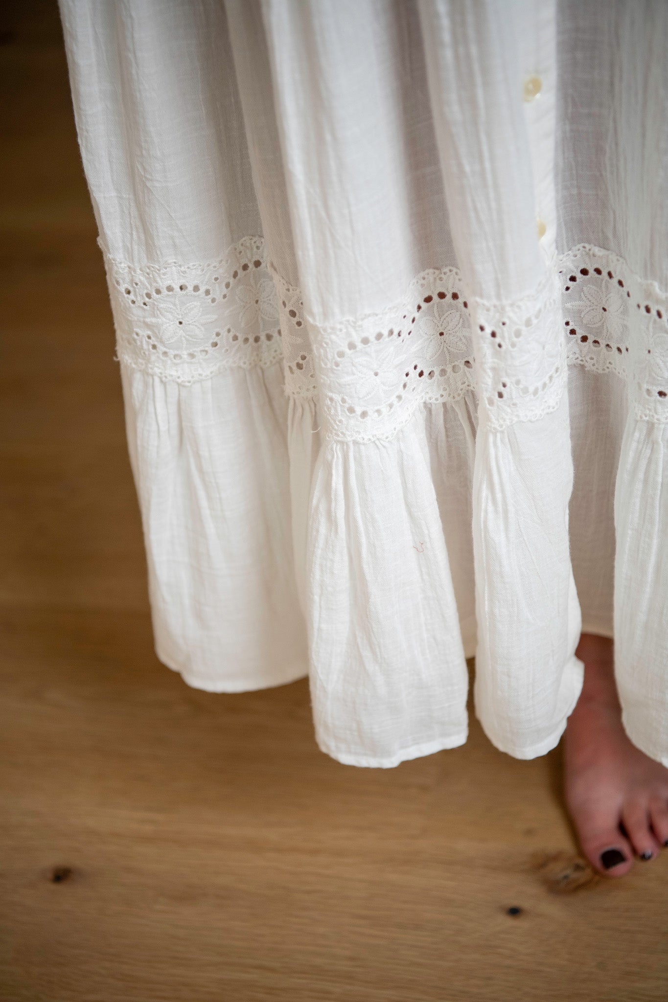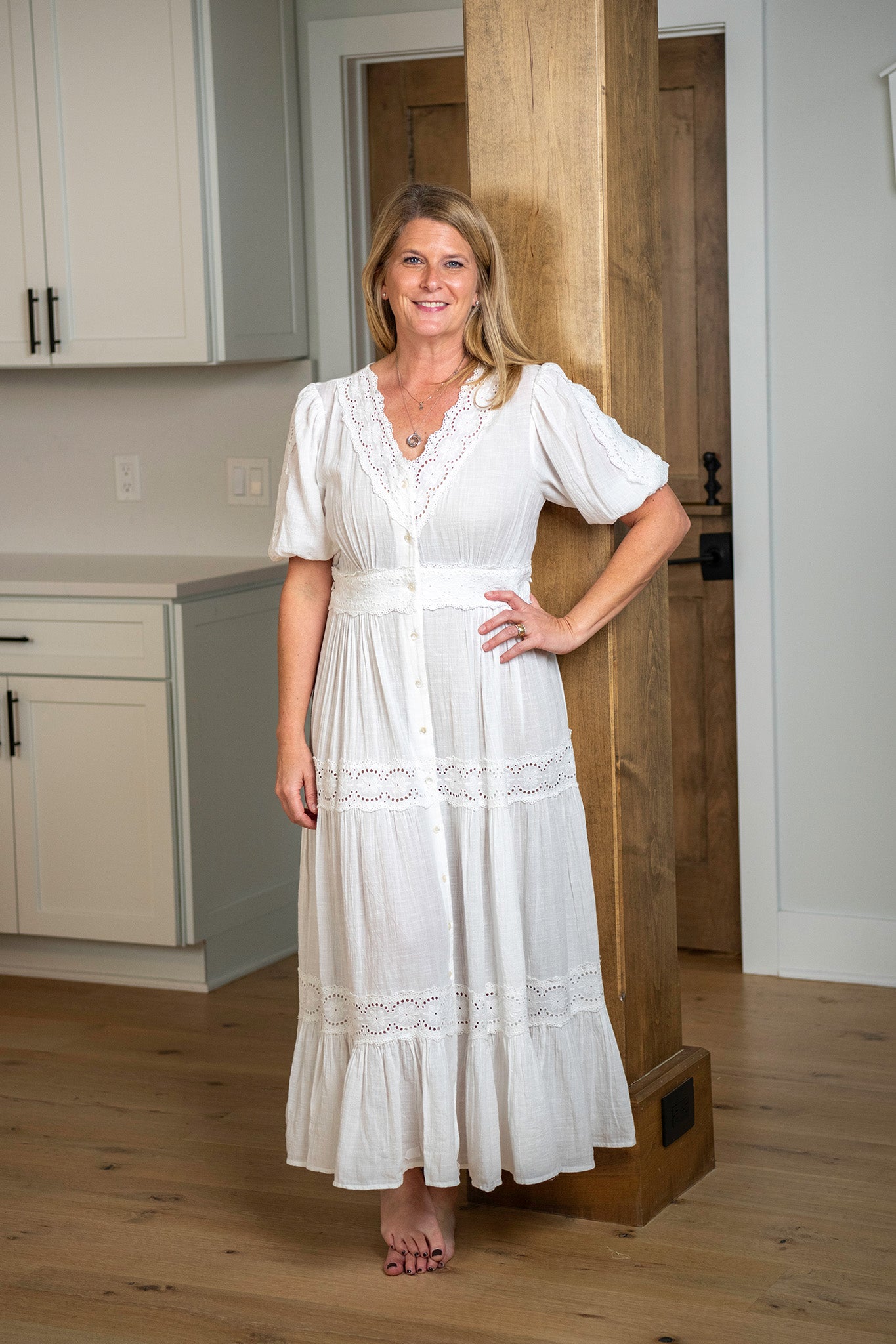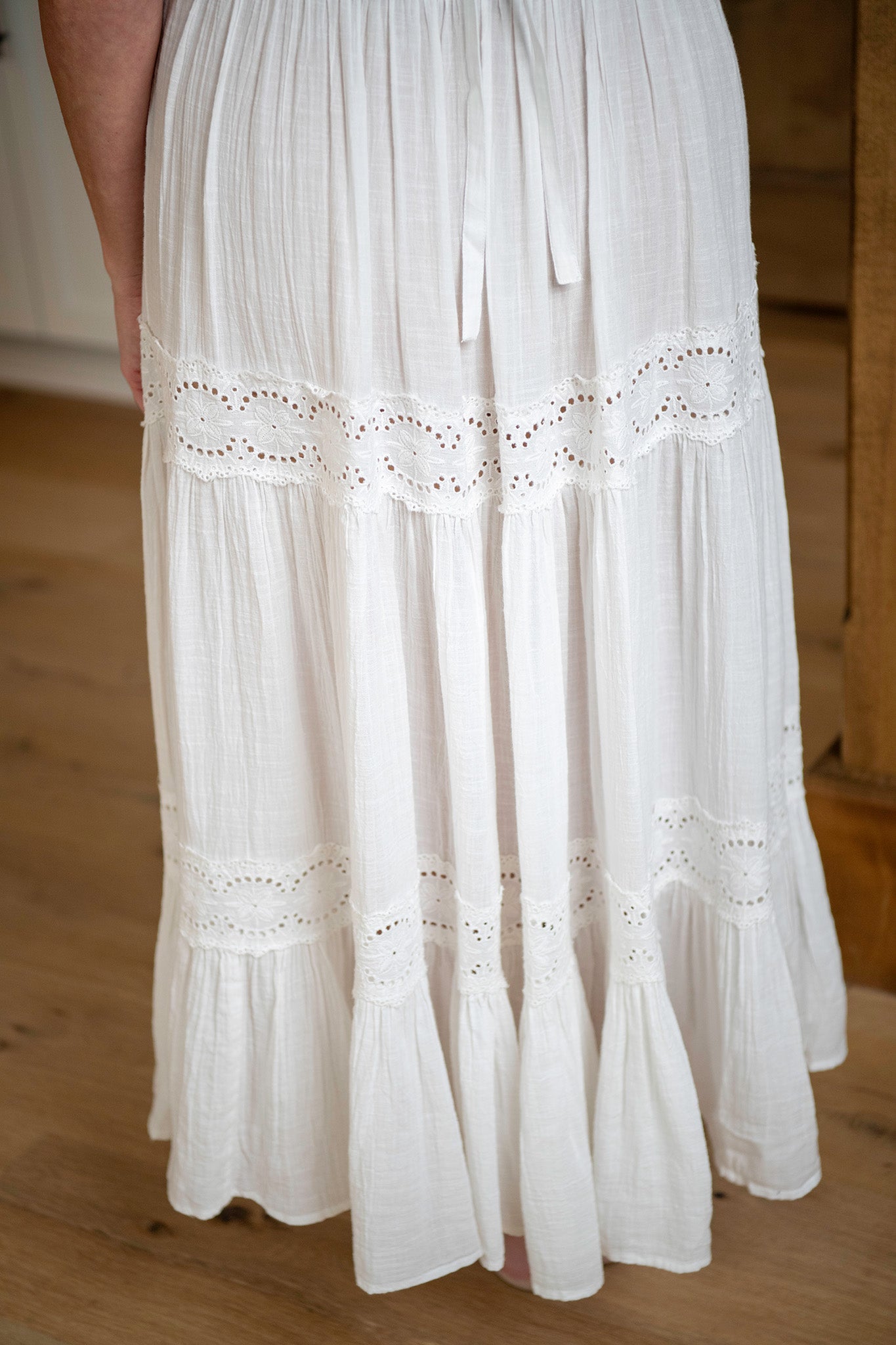 The tiered maxi skirt flows beautifully with every step, finished with eyelet lace trim for a romantic, heirloom-inspired touch. Wear it buttoned up as a dress or styled open as a breezy duster over jeans and a tee. Available in a full range of sizes, the Melissa Dress is as versatile as it is stunning—once it’s in your wardrobe, you’ll reach for it again and again.
