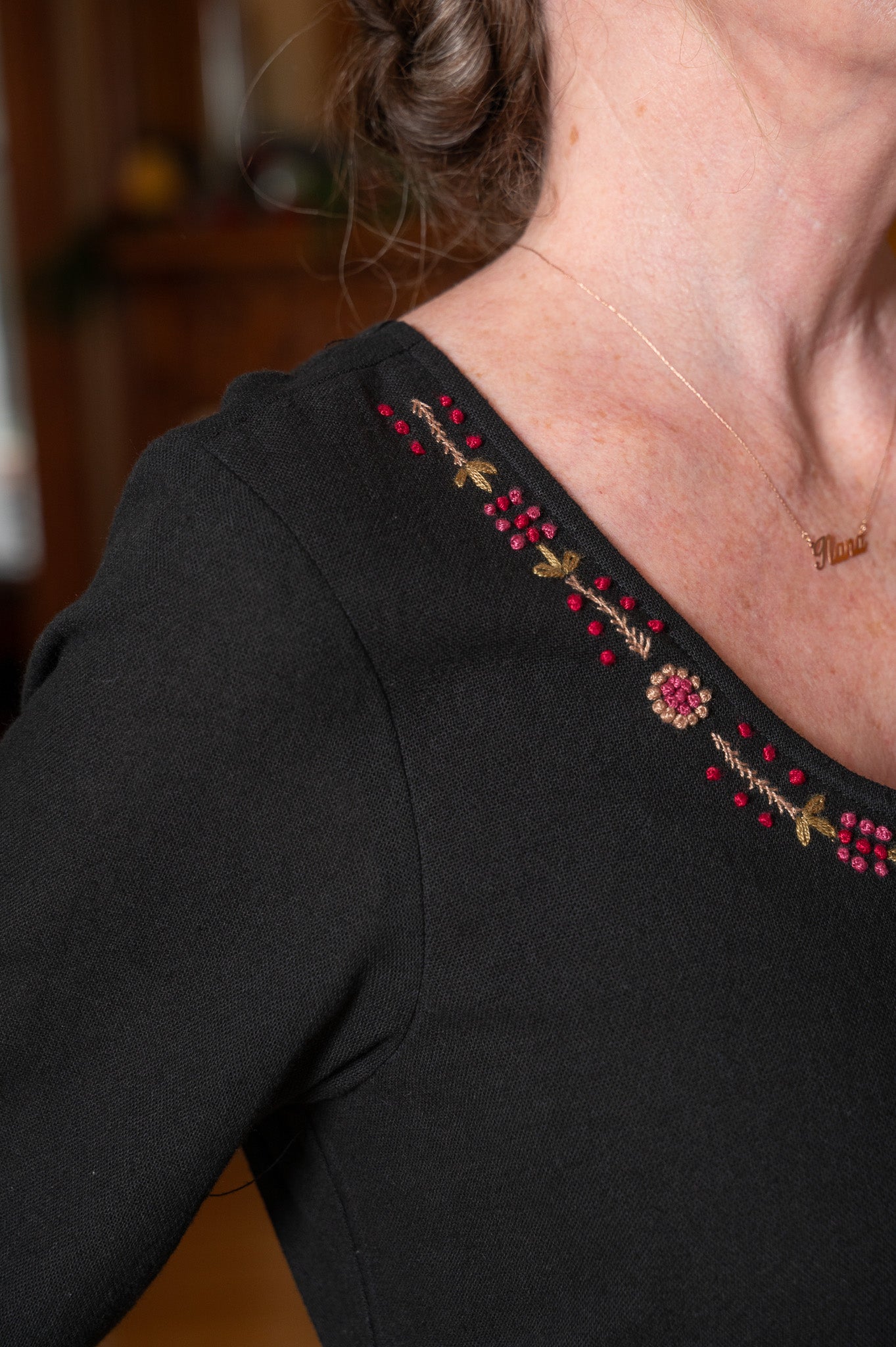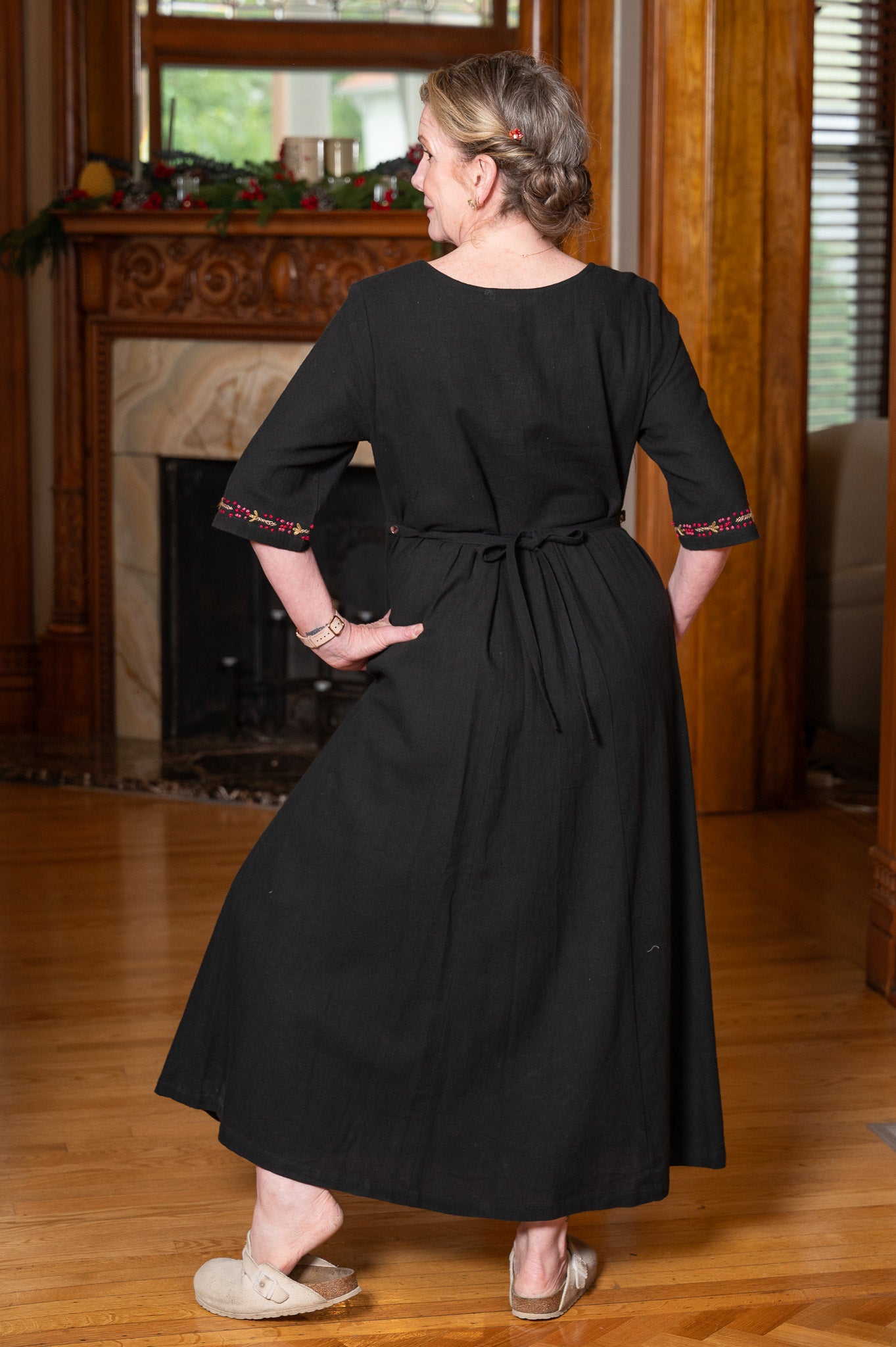 Embroidered florals bloom like quiet poetry against inky black cotton, capturing the magic of handcrafted detail in every stitch. The soft hopsack weave offers gentle structure while staying light and breathable, perfect for layering or wearing all on its own. Thoughtful touches—side seam pockets, a button-tie back waist, and delicate embroidery tracing the neckline, sleeves, and pockets—blend function with charm. With its flowing silhouette and graceful elbow-length sleeves, it’s the kind of piece that feels as timeless as tradition and as easy as modern comfort.