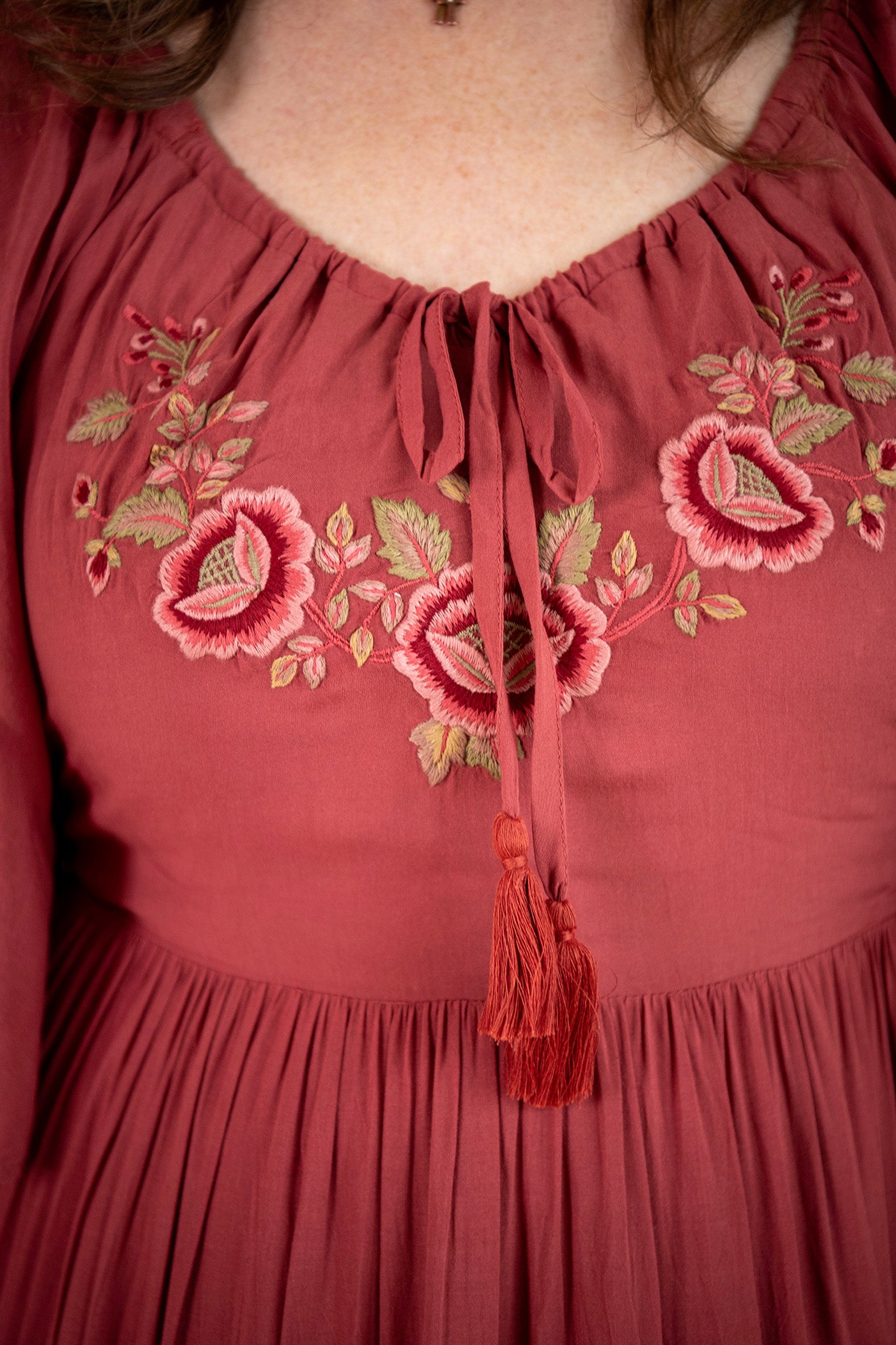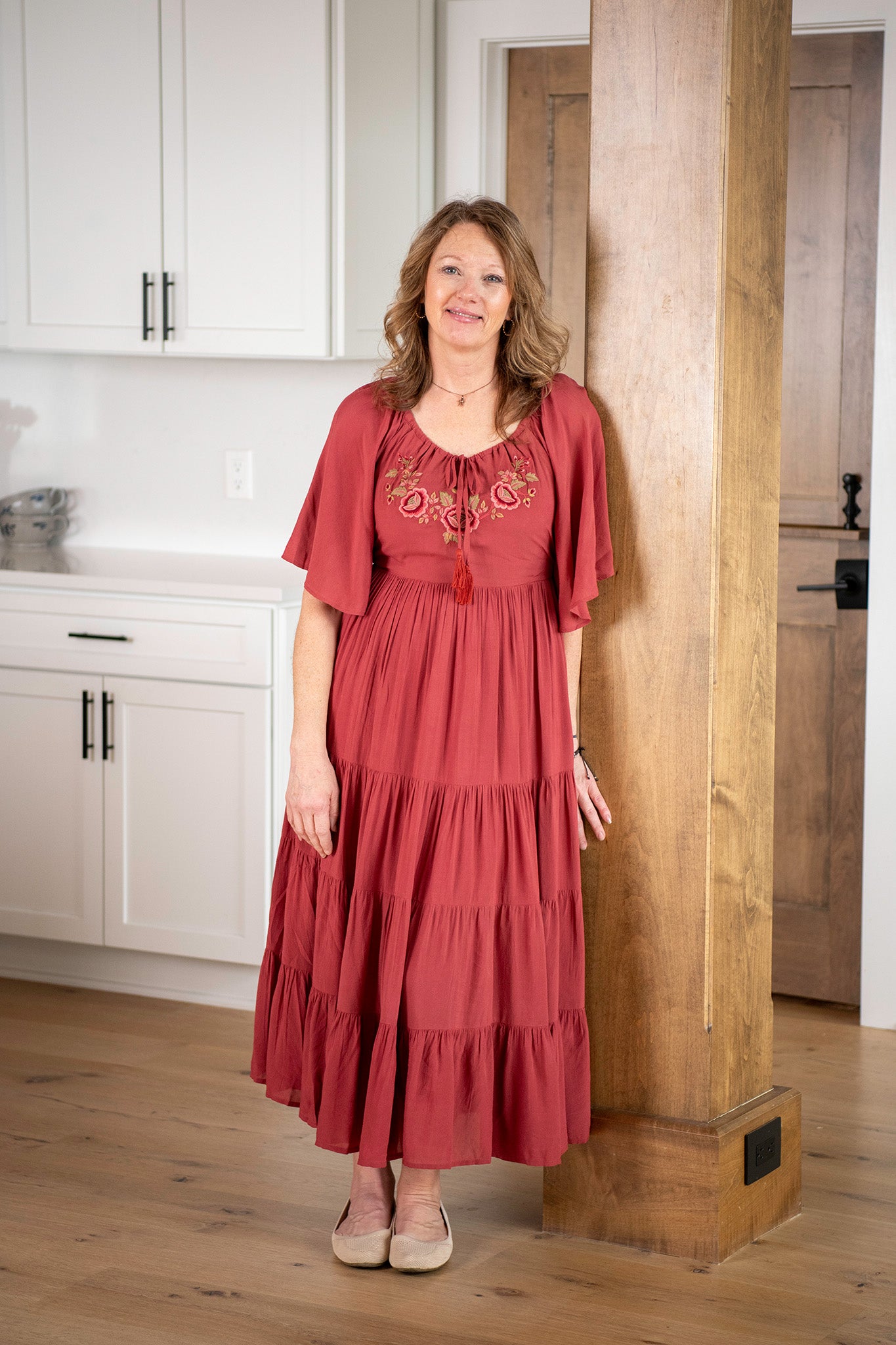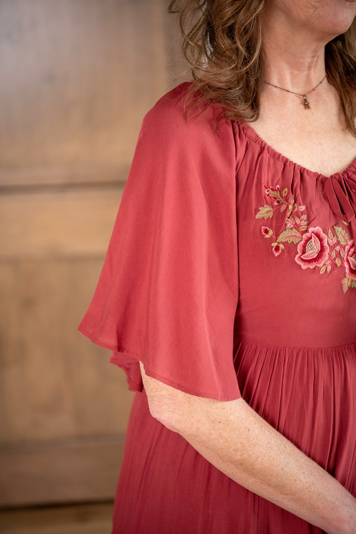 The Muse Dress is what springtime dreams are made of—soft, flowy, and effortlessly romantic. Delicate floral embroidery graces the neckline, while flutter sleeves and a tiered skirt add a touch of bohemian charm. Whether you're strolling through a farmer’s market or sipping sweet tea on the porch, this dress moves with you, bringing easy elegance to every moment. Just add your favorite flats or sandals, and you’re ready to bloom.