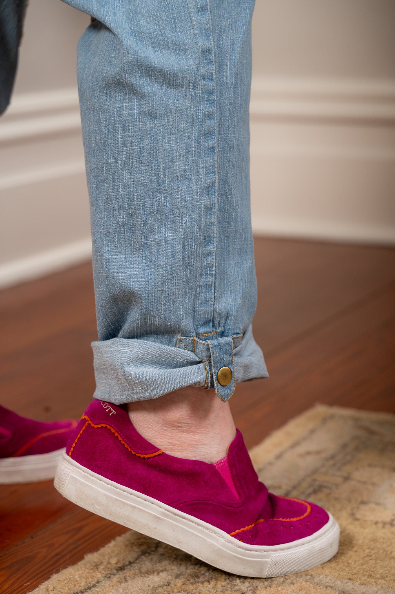 Slip them on and you already know it's going to be a good day. The light-wash denim is relaxed and comfortable through the hip and thigh, but the detail is what makes these overalls genuinely hard to take off. April Cornell's hand-painted florals and soft gingham checks gather in patchwork clusters across the bib, hip, and leg, each one finished with a sweet button accent that gets better every time you notice it. At 97% cotton with a touch of spandex, they wear easily all day without losing their shape, and five real pockets, adjustable shoulder straps, and a roll-tab cuffed ankle with button closure mean every practical detail has been thought through. They pair beautifully with the Patchwork Wanderer Denim Jacket if you want to wear the whole set. They fit true to size — size down if you want something a little more tailored.