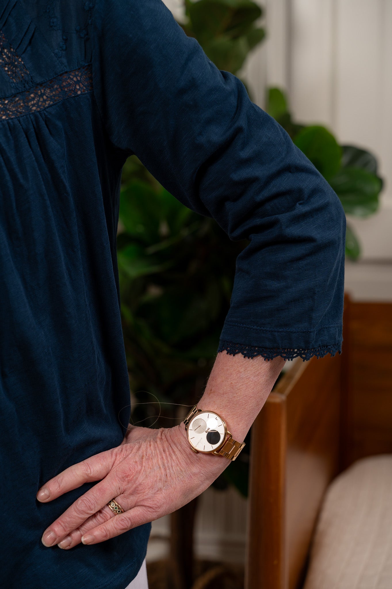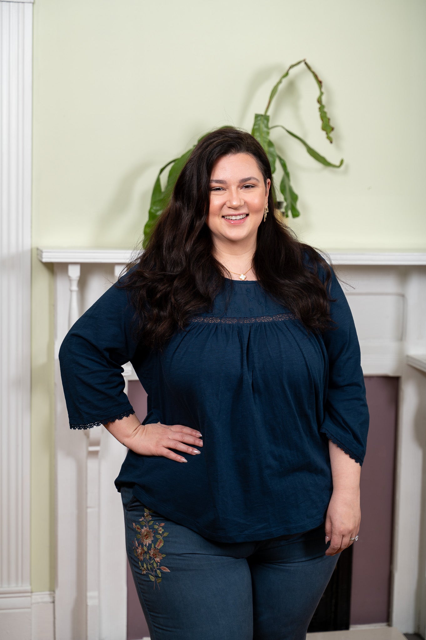 Rich navy cotton with a relaxed, easy drape and the kind of details that make you look twice. Delicate floral embroidery and lace insets at the yoke add beautiful texture, while crochet trim finishes the three-quarter sleeve cuffs with a soft, feminine touch. A chalk button with keyhole closure at the back of the neck is one of those small, thoughtful details you'll love every time you pull this over your head. Fits true to size and layers effortlessly under cardigans, jackets, or all on its own. The kind of top that works as hard as you do and still looks put together at the end of the day.
