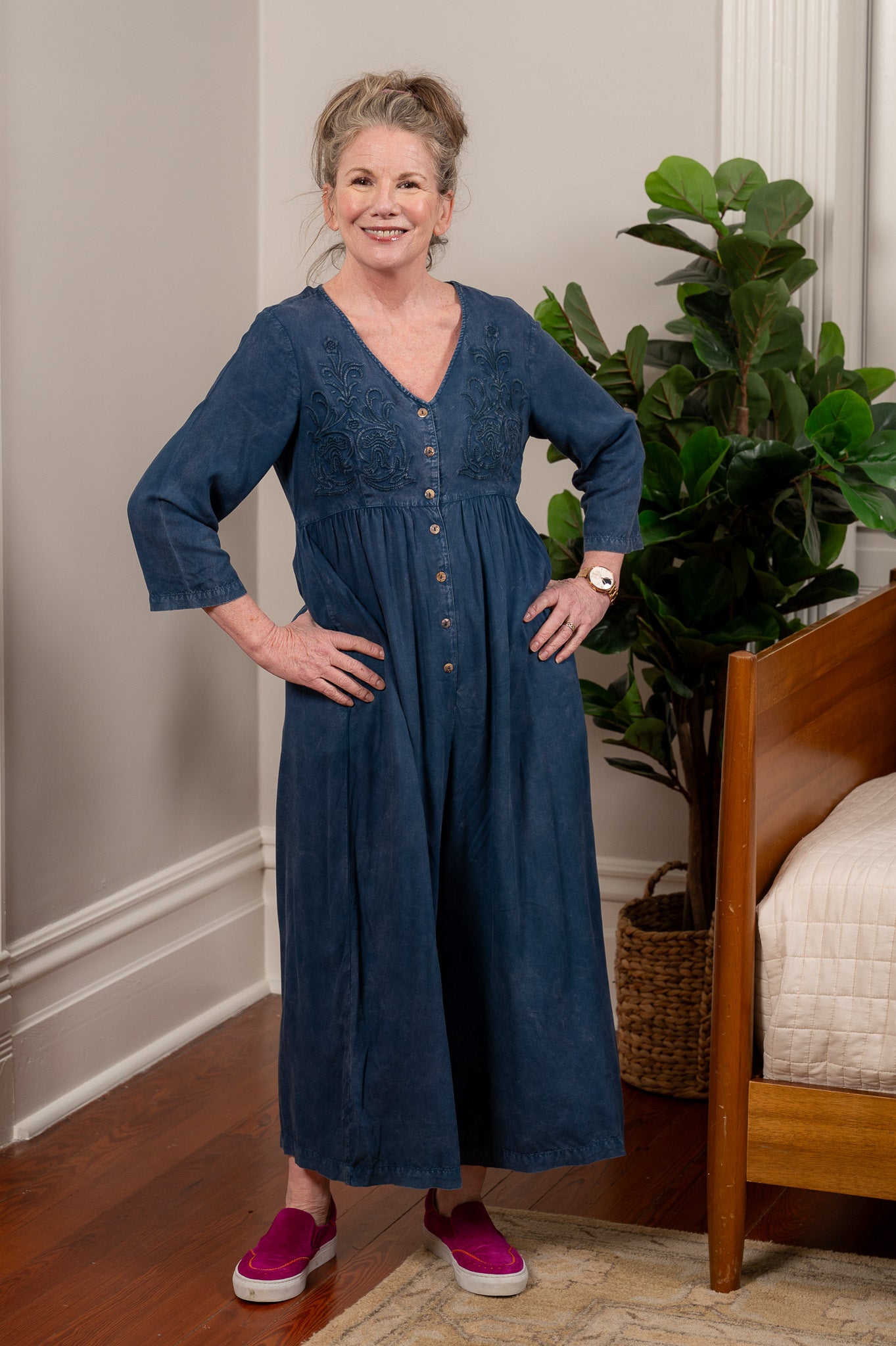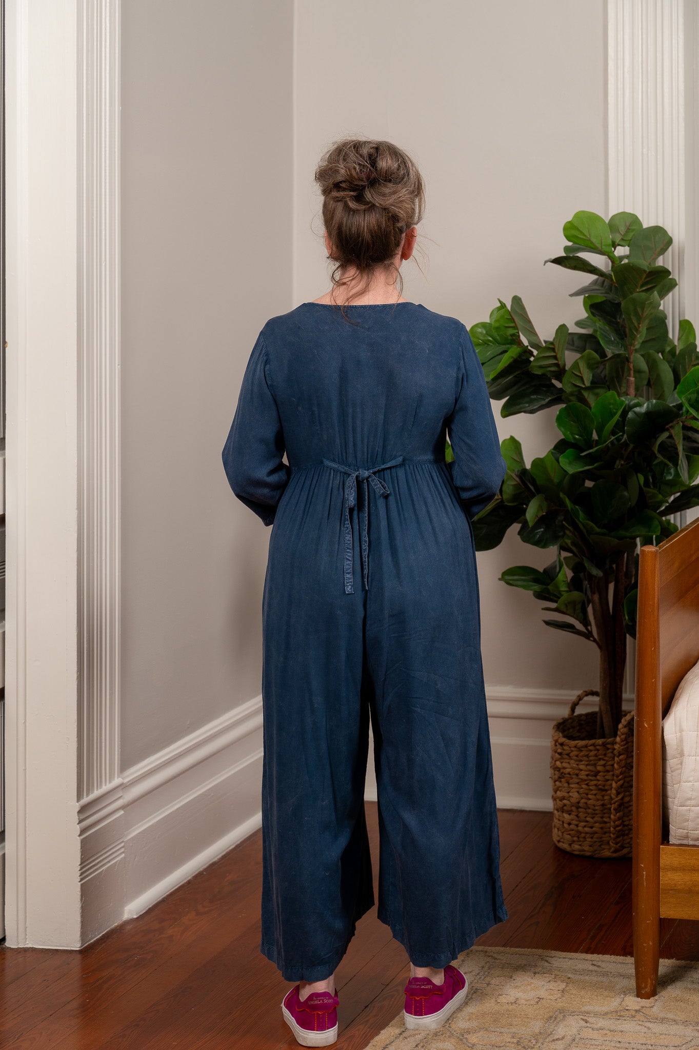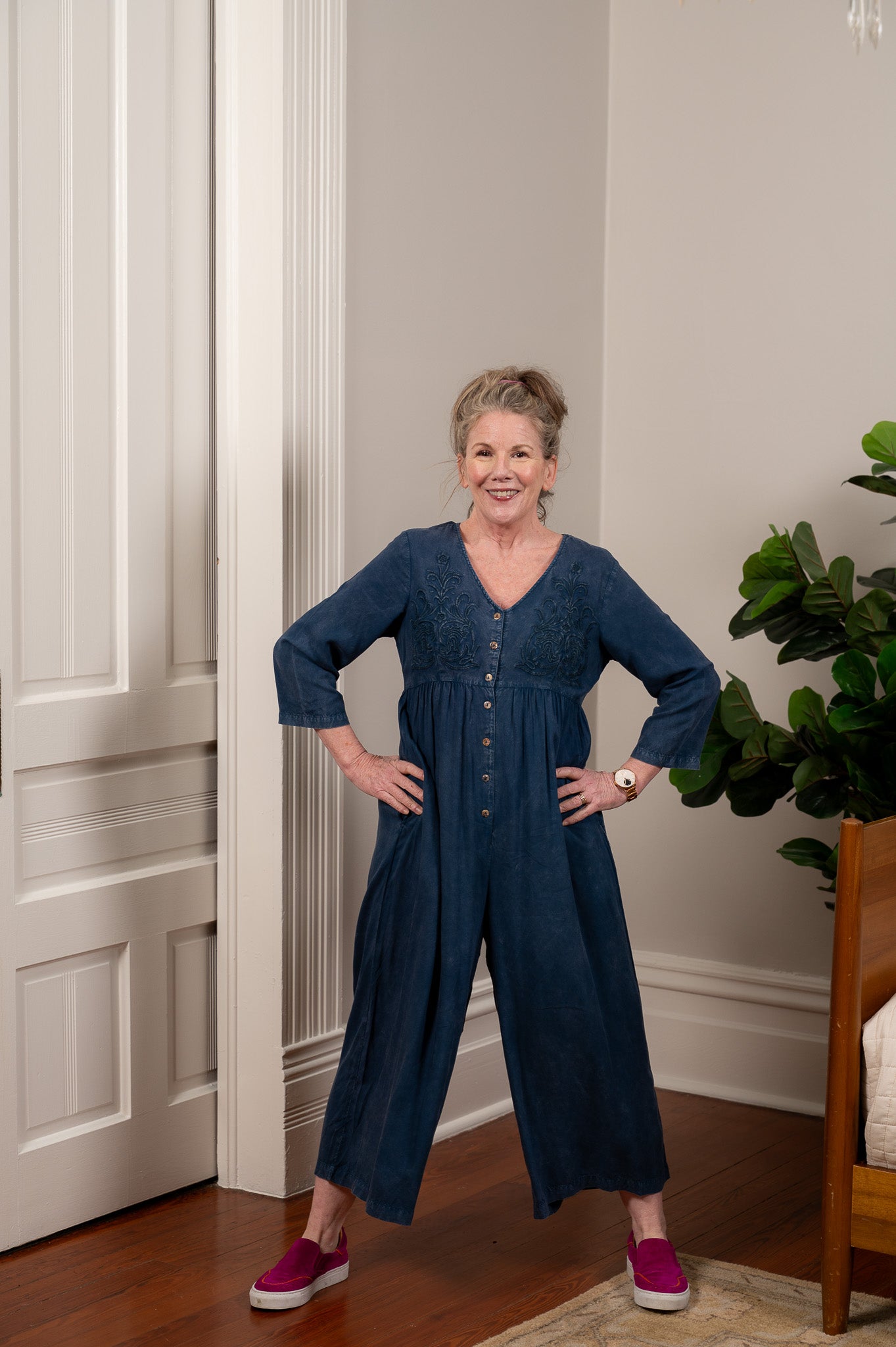 Soft, fluid rayon gives this jumpsuit an easy drape, while hand-guided floral embroidery across the bodice adds depth and artistry. The overall feel is relaxed and intentional — comfortable, expressive, and naturally put-together.