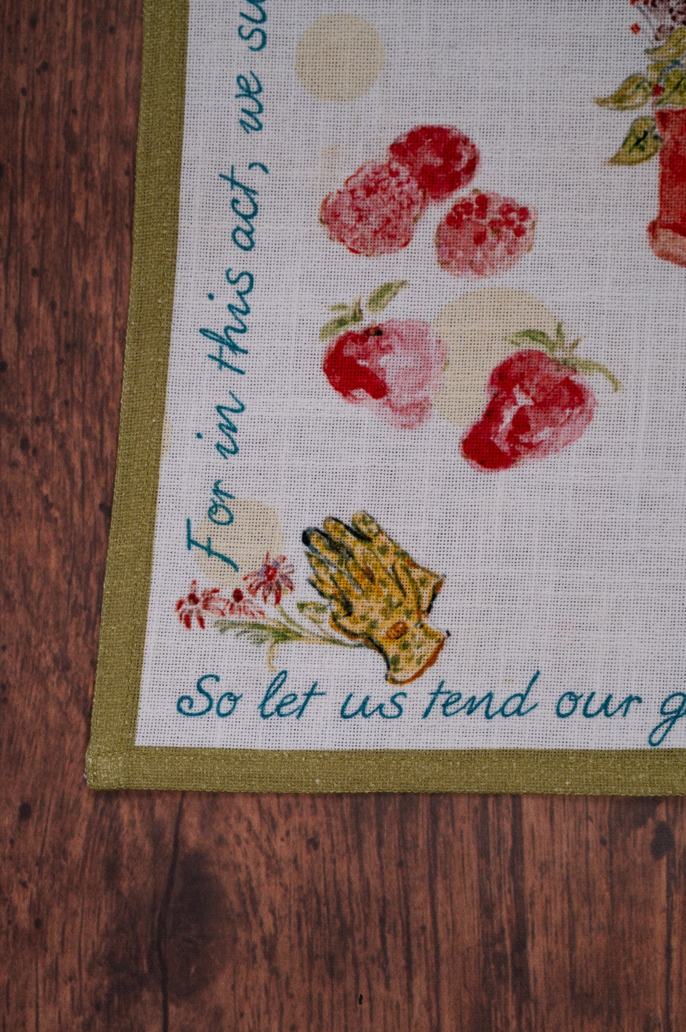A hand-painted watercolor scene of a gardener surrounded by her harvest — baskets of berries, armfuls of flowers, sunshine, and all the colors of a well-loved garden. A sweet original poem wraps around the border like a letter to anyone who knows that the best things in life are grown with patience and tended with care. Framed in olive green and printed on soft 100% cotton, this is the kind of tea towel you hang where everyone can read it.