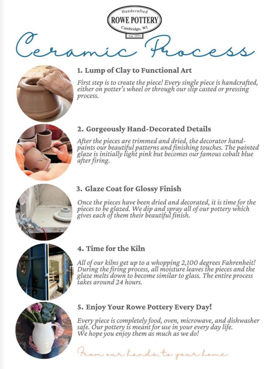 Our Wild Flower Pie Plate from Rowe Pottery is ideal for baking your favorite pies and quiches. The even heat distribution of stoneware and our interior glazing yield perfect baking with easy cleanup. Our timeless beige-hued glaze features soft impressions and crimps made by the potter’s hands, inspired by the glacial landscape ridges of Wisconsin, with cobalt blue wildflower artwork displayed at the center. Enhance your table with this elegant handmade ceramic pie plate, or leave it behind as a thoughtful hostess gift. You'll find an artist's mark near the Rowe Pottery logo on each of the pieces that we offer at Modern Prairie. It adds an element of personalization that we think is so special.