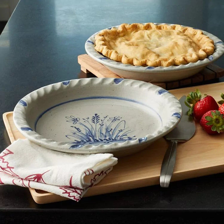 Each piece is wheel-thrown by hand, so the pie dishes have unique characteristics and variations in the freehand artwork that may be slightly different from one another.
